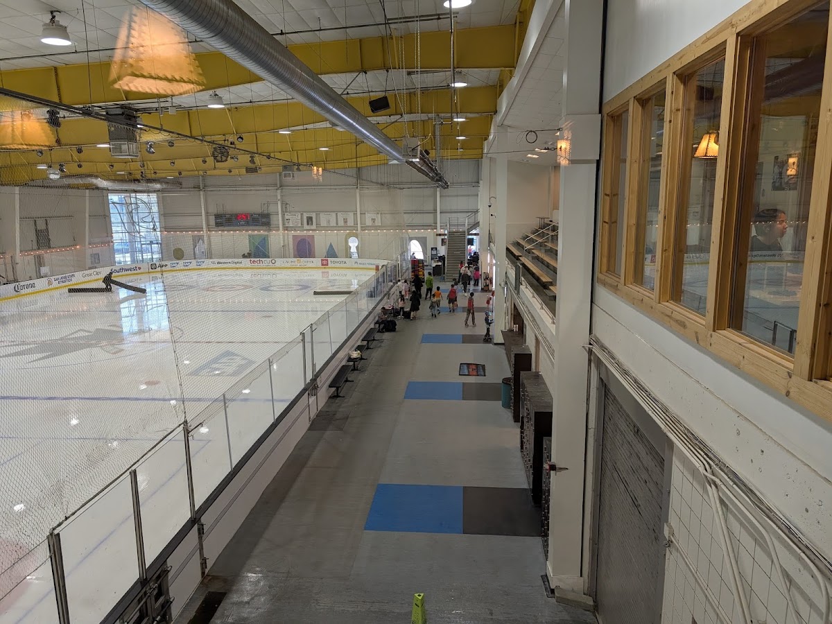Great way to fuel up after exercising on the rink. The food is good enough and there are hockey translation on the screens. Also there are good views on both rinks from the side windows so you can watch live game sitting here.